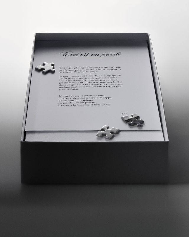 Une mise en abyme conceptuelle : un puzzle représentant la photographie d’un puzzle. Créé en collaboration avec la photographe de nature morte Cécilia Poupon, ce visuel minimaliste et radical transforme un objet du quotidien en expérience artistique.